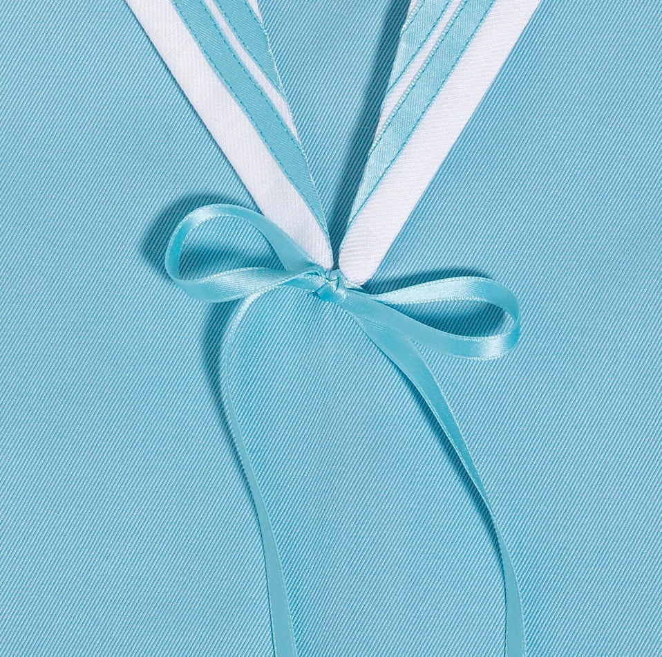 This version of LOTTE comes in turquoise, making it a very special outfit. This A-Line dress features short cap sleeves, a white sailor collar with ribbon details and concealed buttons and two straight pleats on the skirt.
